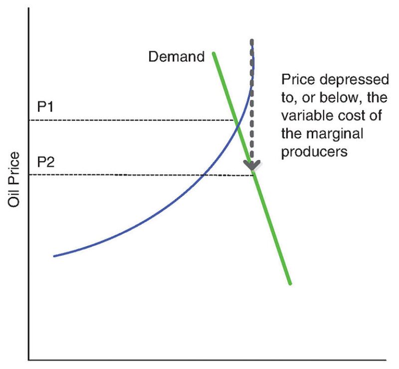 In the short run, the price is determined by supply and demand (Fig. 2). Note that the curves meet, but do not cross (Aguilera and Radetzki do not show it this way). Oil supply and demand are in balance. Whereas the long-run supply curve in Fig. 1 included all costs including capital cost and profit, we should consider the supply curve in Fig. 2 to be variable costs (salaries, maintenance, transportation, debt servicing, etc.). In an environment represented by Fig. 2, almost everyone is making money, but the marginal barrels may be sold at lifting or variable cost.