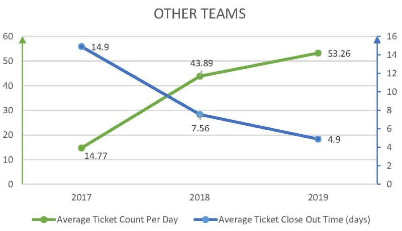 The optimized process has reduced the average time for task completion by operators from 2.55 days before 2019 to 2.01 days in 2019, which affects 67% of all work orders. While the average ticket close-out time was reduced by 21%, the average ticket count per day increased by 42.5% in 2019, indicating the ability of operators to manage a heavier workload with increased efficiency. For all other teams, the average ticket count per day increased by 23% while average ticket close-out time decreased by 41% in 2019.