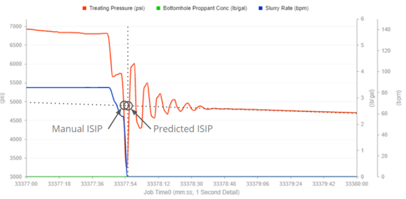 ISIP is defined as the difference between the final injection pressure and the drop in pressure caused by friction in the wellbore and perforations or slotted liner. The ISIP flag is placed at the end of the stage pumping time, immediately after shut-in and before the pressure starts to drop. This is estimated by placing a straight line on the early pressure decline and locating the point in time where the pressure rate is zero. ISIP picks have varied in the industry as data collection becomes more and more constrained. Quite often, data collection ceases after the pumps are shut down to save operational time (and, therefore, money). Thus, only a few seconds are recorded after the rate is zero, making it very difficult to place a straight line because there is no pressure decline. For this reason, many field engineers pick ISIP at the first or second spike of the water-hammer effect observed at shut-down, making this process inconsistent.